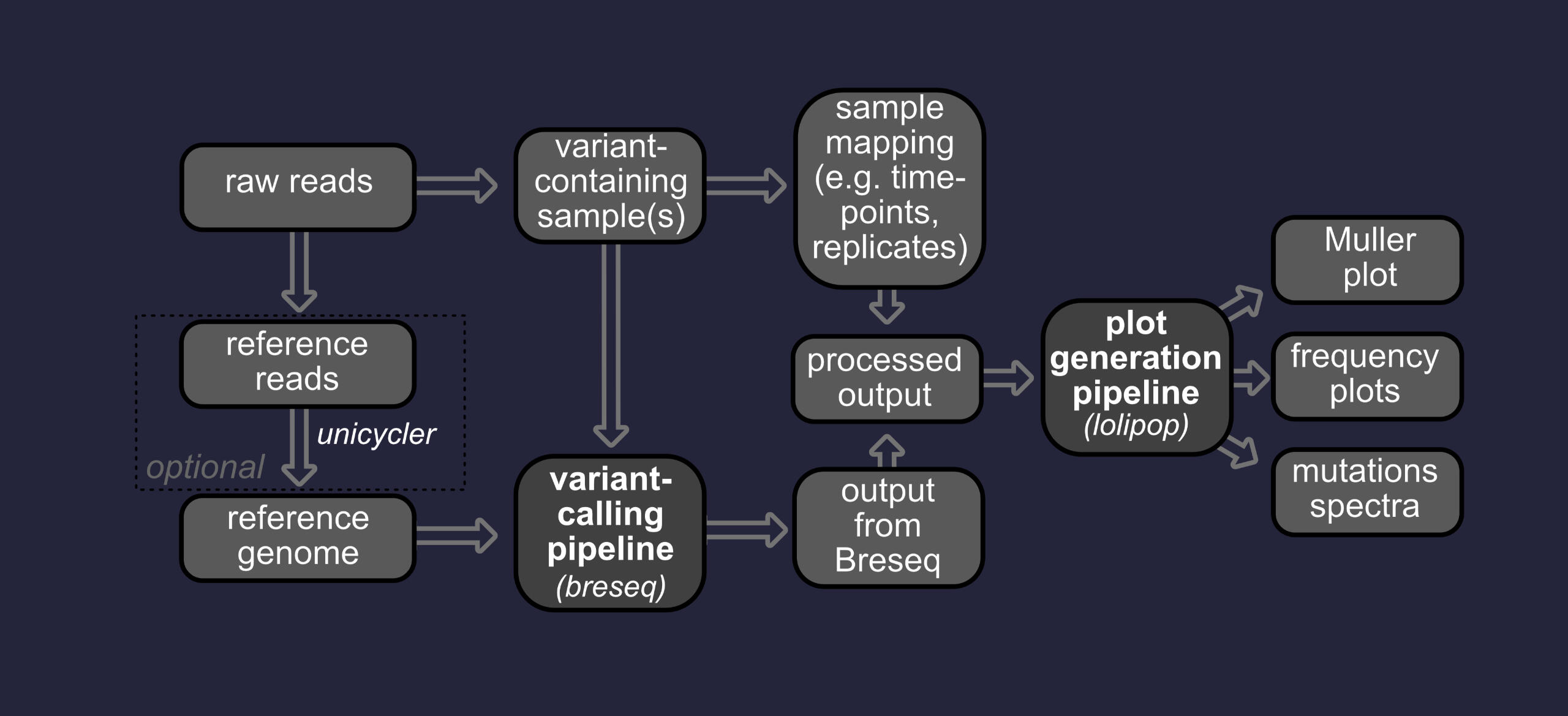 Variant calling is the process of identifying mutations in an evolved lineage. Mutations are predicted by identifying changes in the genome sequence over the course of an experiment (e.g. evolve-and-resequence)